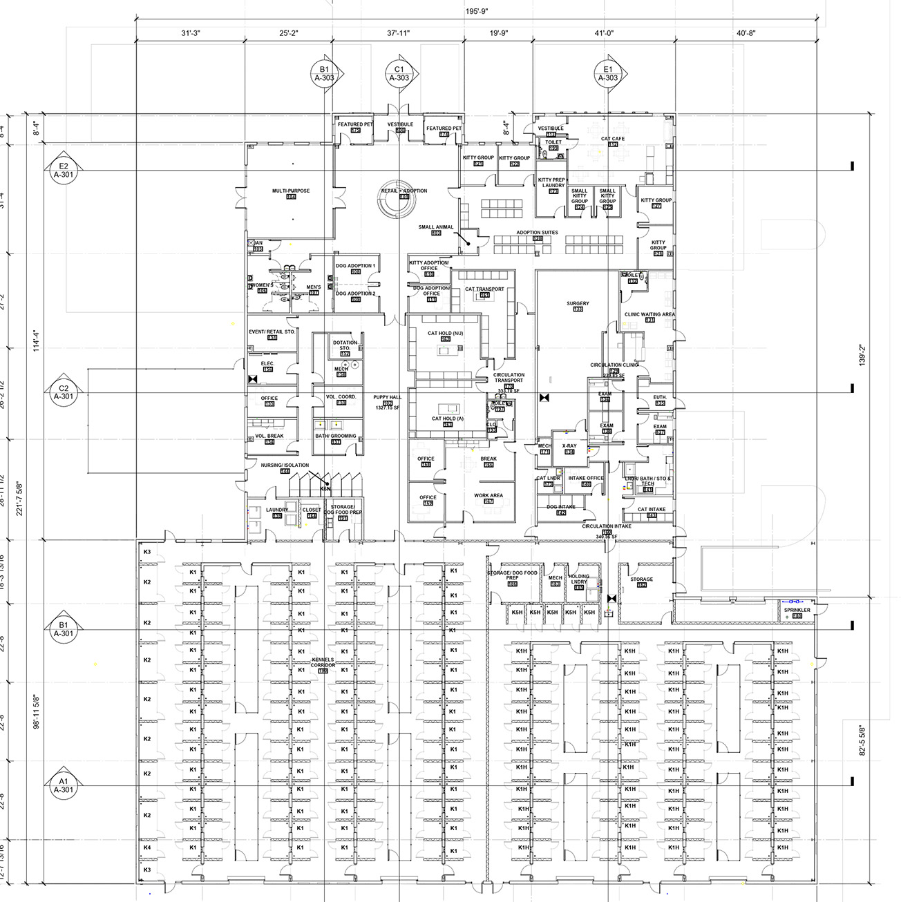 Just beyond our Adoption Center, the Pooch Pavilion will have five distinct areas/hallways dedicated to dog housing, including kennels and dog runs. Each hallway within the Pooch Pavilion will accommodate between 17 and 22 dogs, providing them with comfortable, secure, and well-organized spaces.